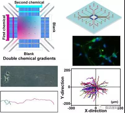 中南大學劉文明課題組和西北農林科技大學王進義課題組針對這一問題,采用微流控芯片技術,并通過在特定微管道內引入水凝膠材料,成功實現了不同生化分子在不同方向濃度梯度發生的微尺度、時間與空間控制,驗證了多向水凝膠屏障可滿足芯片內快捷、穩定、長時間的單一線性和雙輻射化學濃度梯度的無剪切力發生;進一步,基于微流控精確流體操作,完成了芯片內的鼠原代皮質神經元培養,并使其保持高活性、代表性神經元表型和神經突起生長及延伸;重要的是,通過實驗研究證實了該芯片模型可用于神經導向吸引與排斥因子梯度共存微環境下的軸突導向研究。該研究建立的微流控多梯度芯片為探究神經發生、發展及再生提供了一很好的微尺度操作與分析原型平臺。研究者認為,這一方法學進展有助于優化設計和仿生構建可時空控制的多重濃度梯度組織微環境系統,在神經生物學、腫瘤學、炎癥、及******醫療等領域均具有重要的應用研究潛力。